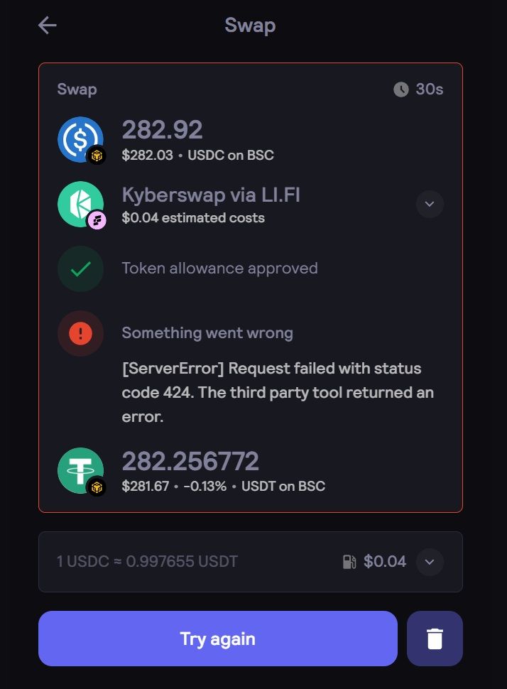 I guess this may be something to do with Li.Fi and not really Sonar but I thought I'd report it anyways. I was just swapping USDC for USDT on BSC.ak